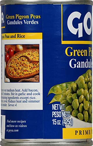 Goya Foods Green Pigeon Peas (Gandules), 15-Ounce (Pack of 24). Pigeon peas are a favorite in Caribbean kitchens, especially in Puerto Rico and the Dominican Republic. GOYA Green Pigeon Peas are flavorful and have a grain-like consistency. Gluten Free, Low Fat, Trans Fat Free, Saturated Fat Free, Cholesterol Free and Kosher. Good Source of Fiber. Contains Protein.