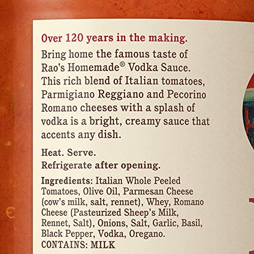 All Natural, Premium Quality: Rao’s Homemade Vodka Sauce is a premium, slow-cooked, classic Italian pasta sauce.Each jar brings you the warm, classic flavor of Italian cheeses and homemade sauce