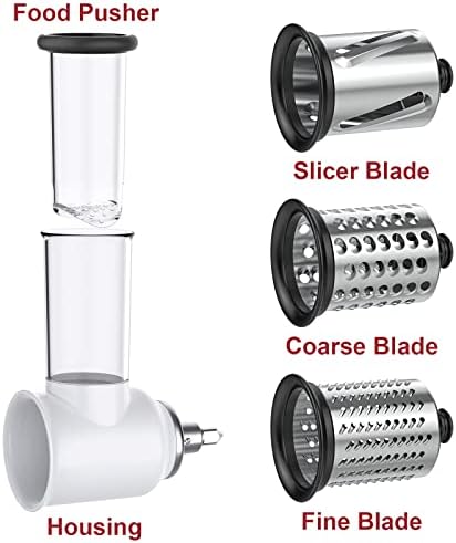 This attachments for kitchenaid stand mixer includes 3 interchangeable stainless steel drum blades: 5mm Slicing Blade, 6mm Coarse Shredding Blade, 3mm Fine Shredding Blade; 1 Cleaning Brush; 1 Food Pusher; 1 White Housing.